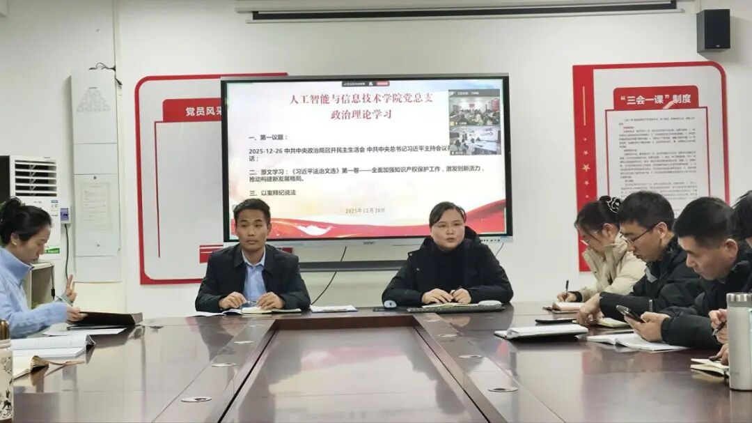 2025年12月30日,人工智能与信息技术学院党总支组织郑州校区和开封校区全体党员及教职工,开展政治理论学习活动。本次学习活动由人工智能与信息技术学院书记崔琳主持。主要学习内容有:一、第一议题:2025-12-26 中共中央政治局召开民主生活会中共中央总书记习近平主持会议并发表重要讲话;二、原文学习:《习近平法治文选》第一卷——全面加强知识产权保护工作,激发创新活力,推动构建新发展格局;三、以案释纪说法。