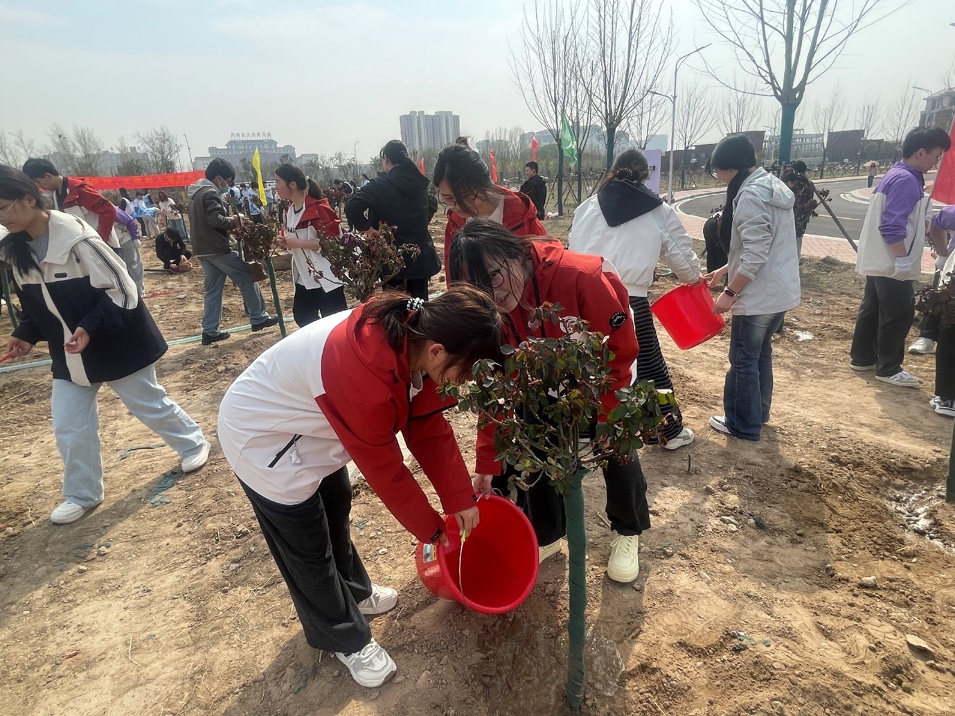 活动现场,在学校的统一部署、统筹安排下,人工智能与信息技术学院党总支书记崔琳、院长王磊带头参与,与计算机应用技术(中外合作办学)专业师生们一同投身植树劳动,大家热情高涨、干劲十足。活动中,崔琳书记、王磊院长与师生们分工明确、默契配合,有的挥锹铲土、整理树坑,有的小心翼翼扶苗扶正,有的俯身填坑踩实,有的提水浇灌,每一个环节都认真细致、有条不紊,现场一派热火朝天的劳动景象。经过大家的共同努力,一排排新栽的树苗迎风挺立、生机勃勃,为美丽校园增添了一抹鲜活的绿意,也寄托了师生们对绿色家园的美好期盼。