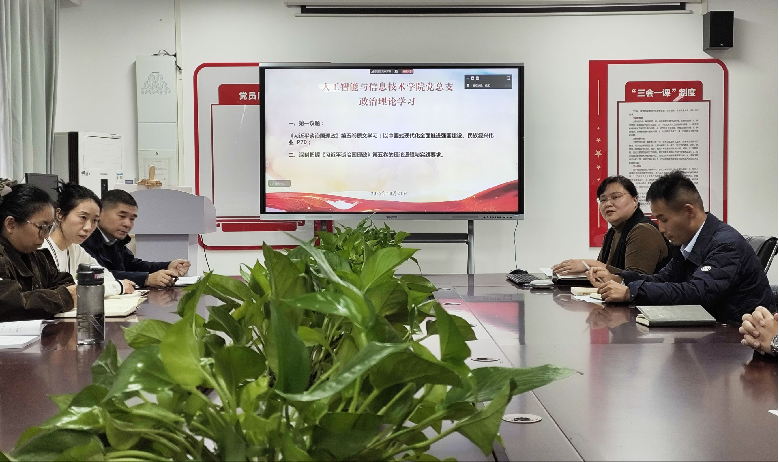 2025年10月21日,人工智能与信息技术学院党总支组织郑州校区和开封校区全体党员及教职工,开展政治理论学习活动。本次学习活动由人工智能与信息技术学院党总支书记崔琳主持。主要学习内容有:一、第一议题:《习近平谈治国理政》第五卷原文学习:以中国式现代化全面推进强国建设、民族复兴伟业P70;二、深刻把握《习近平谈治国理政》第五卷的理论逻辑与实践要求。